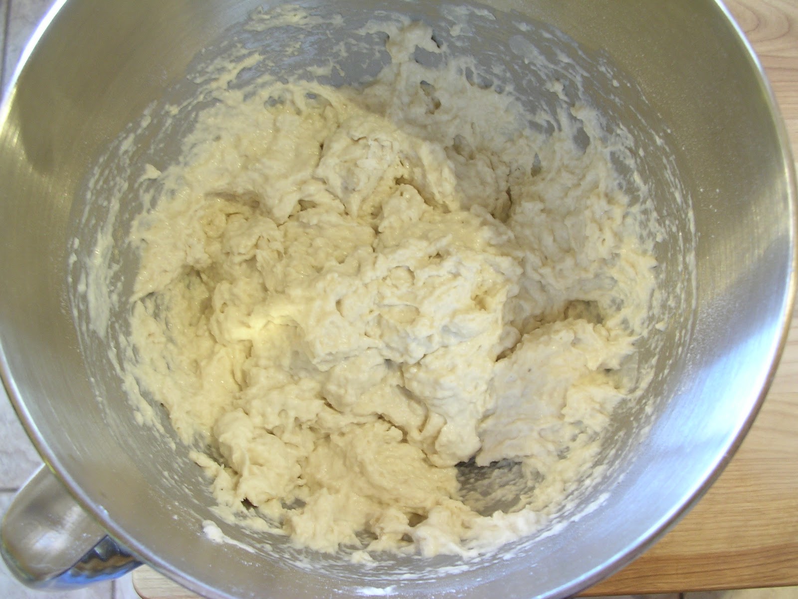 The directions tell you to mix on high speed for 10 to 30 minutes (!) with the dough hook, and during that process, the dough will come together and clean the sides of the bowl, as well as pull away from the bottom a little bit. Well, if you say so...
